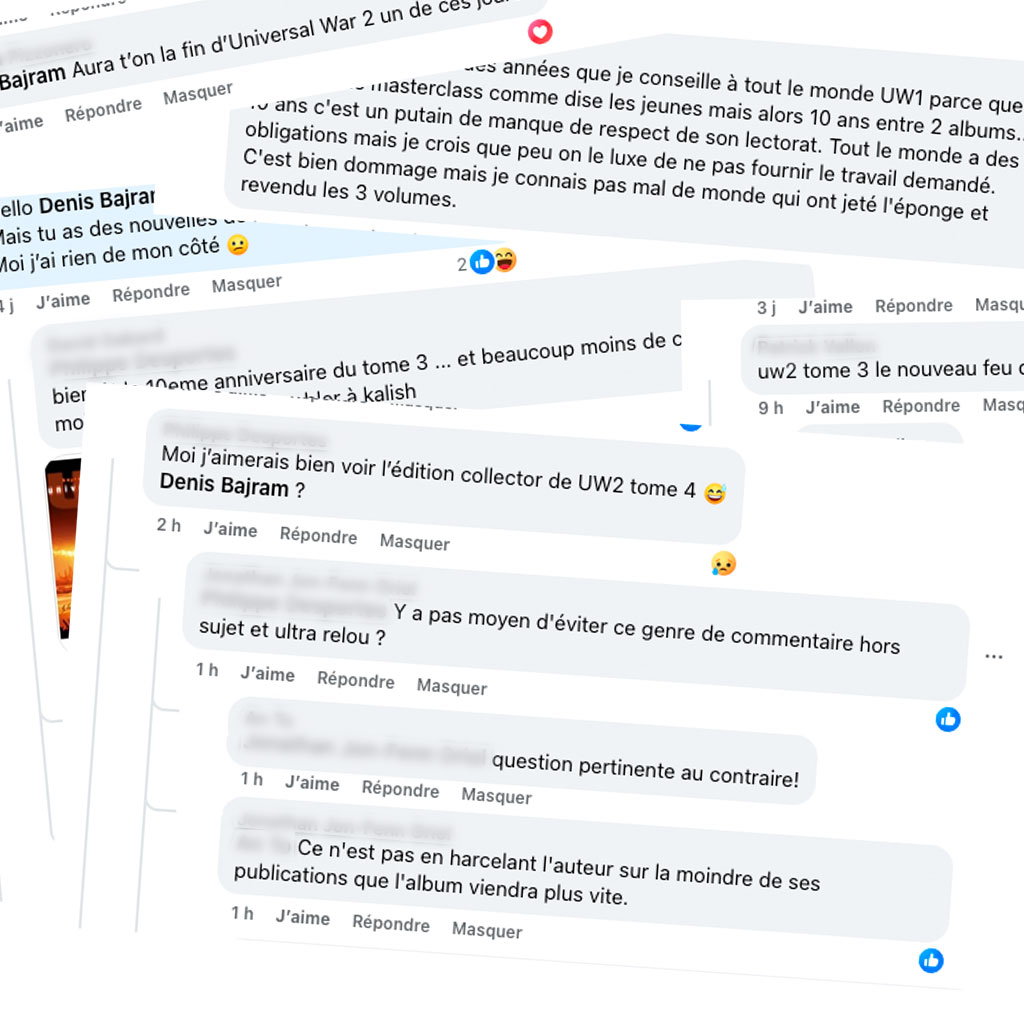 Que pensez-vous que provoquent sur moi les messages de plus en plus insistants, culpabilisants, voire violents, que je reçois pour faire paraître la suite d’Universal War Two ? Croyez-vous vraiment que cela va m’aider à être dans l’état d’apaisement relatif dont j’ai besoin pour finir le story-board des trois derniers tomes d’UW2 ? Croyez-vous que ça va me faire gagner du temps ? Croyez-vous que ça va me convaincre que ça vaut le coup que je me torture pour ce genre de lecteurs ?