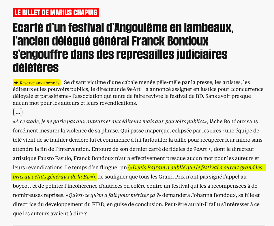 Libération m’apprend que le délégué général du FIBD d’Angoulême, Franck Bondoux, a déclaré dans sa conférence de presse de jeudi : « Denis Bajram a oublié que le festival a ouvert grand ses bras aux états généraux de la BD ».
